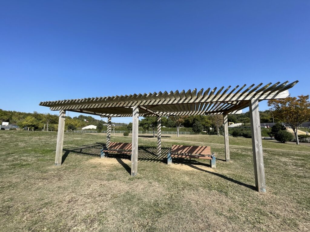 遊具などはないですが広い芝生広場です。屋根のある場所が少ないのですが、テント持ち込み可能なようですのでありがたいですね。芝生が売りな公園で芝生が荒れてしまうからだと思いますが、スパイクを履いて遊ぶことは禁止されています。